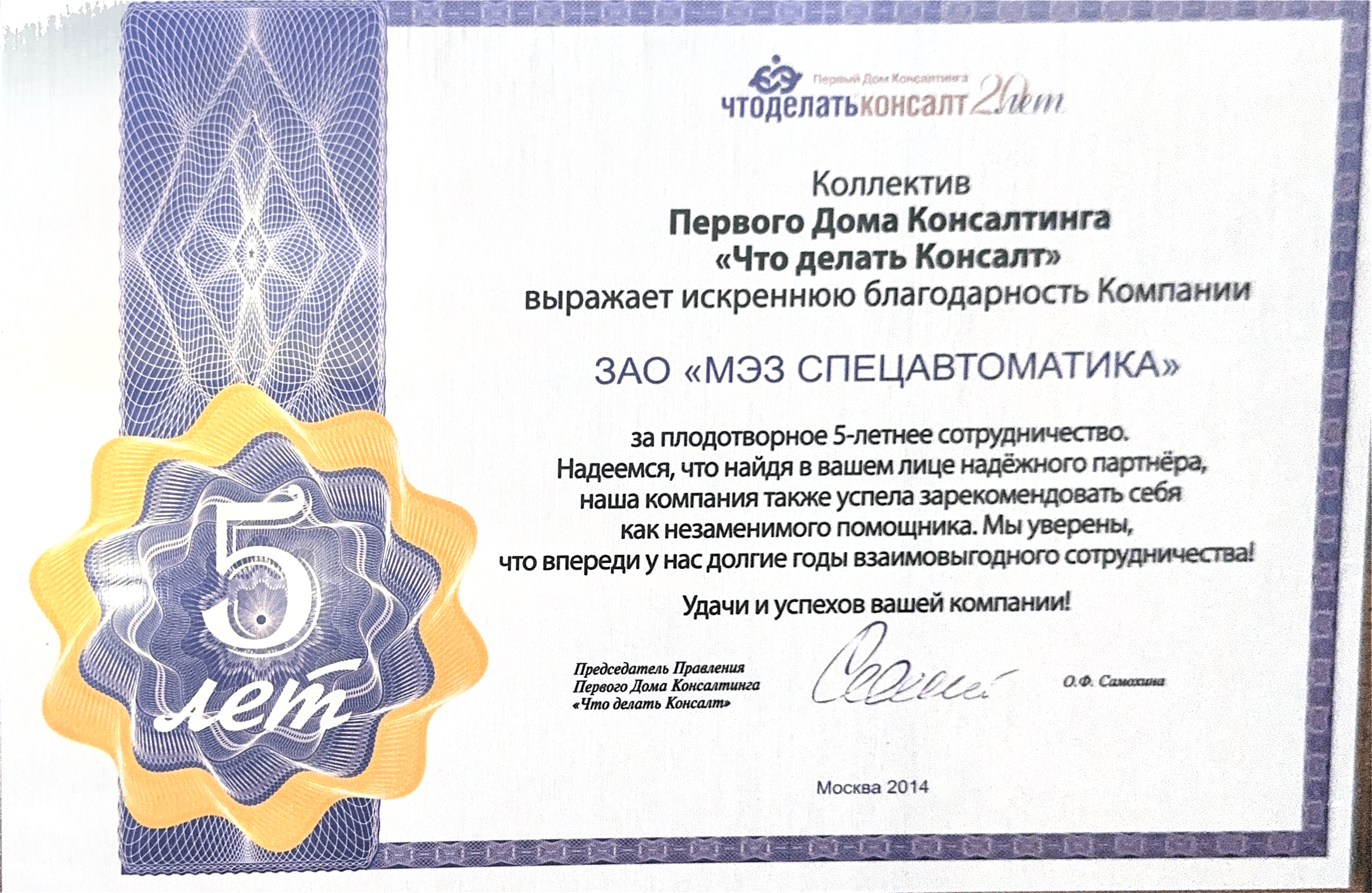 Благодарность, 5 лет сотрудничества, ЧтоДелатьКонсалт, 2014 |