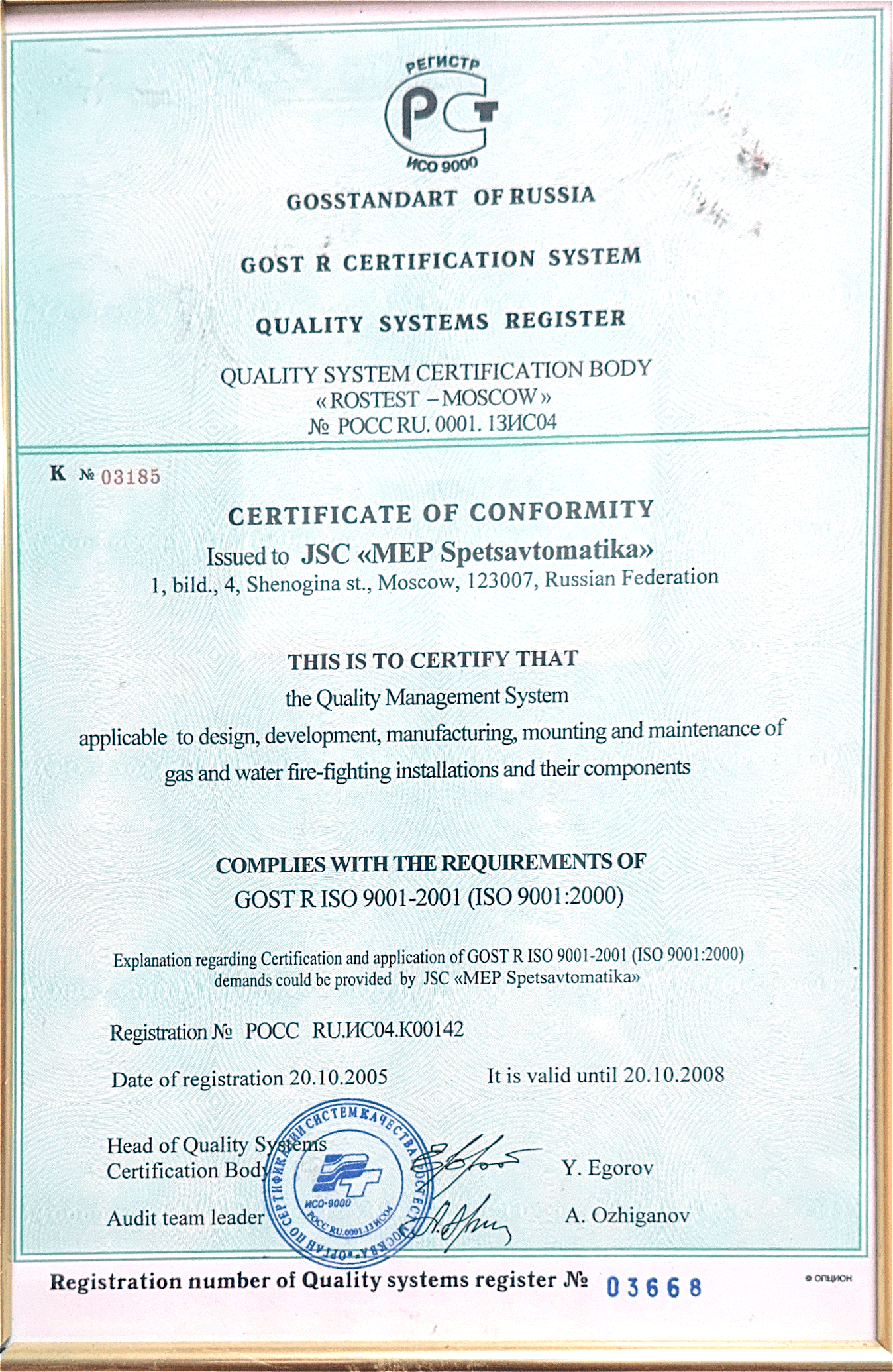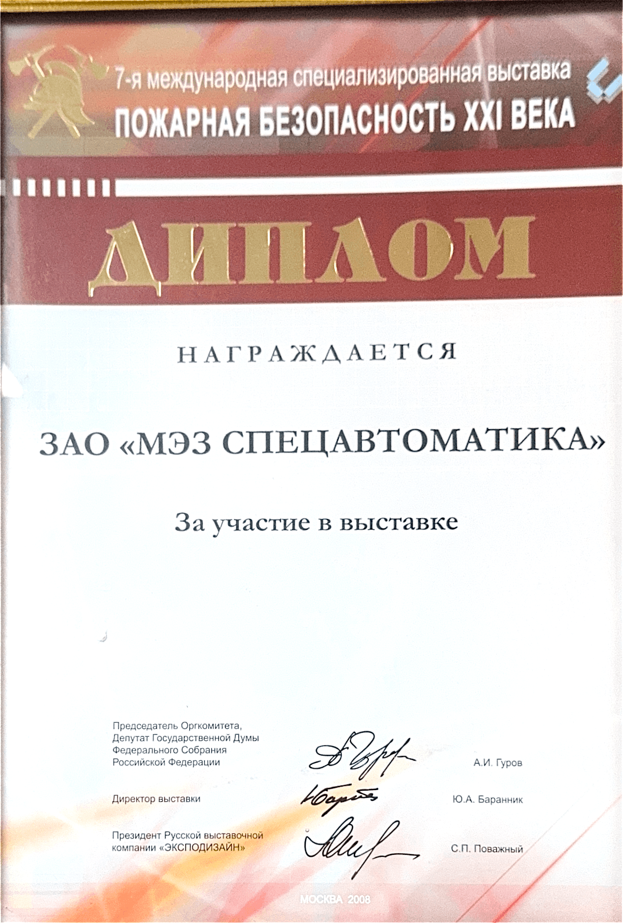 Диплом за участие, 7 международная выставка Пожарная безопасность 21 века, 2008г |