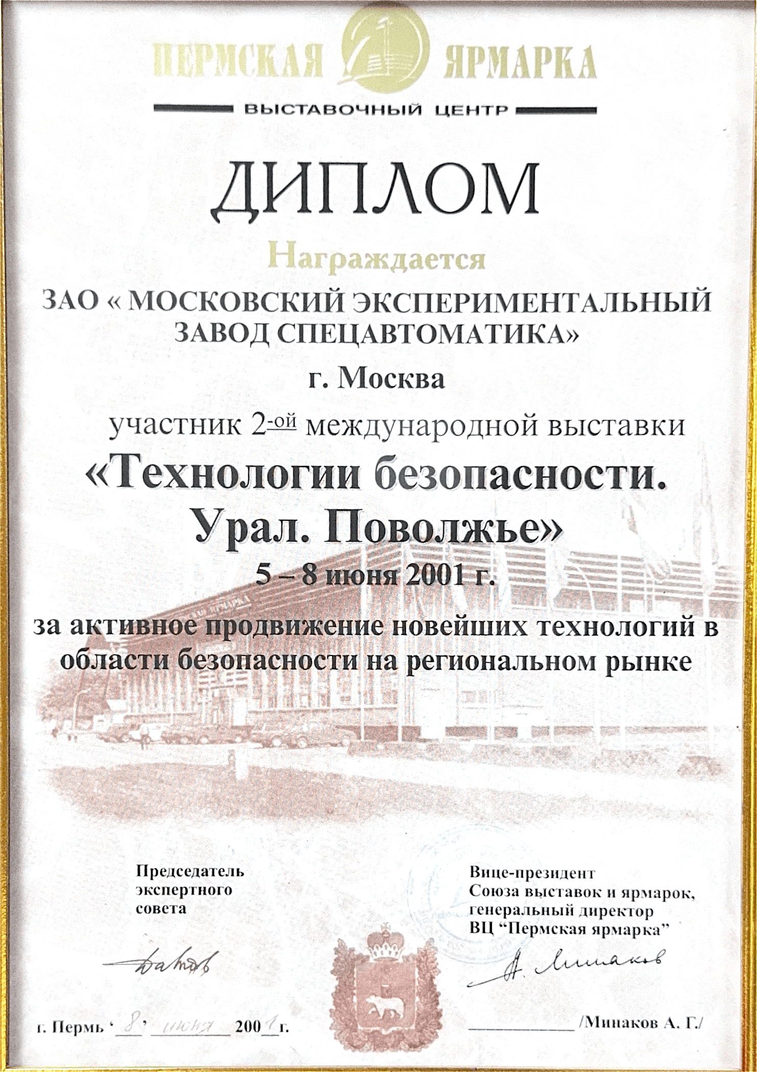 Диплом, пермская ярмарка, "технологии безопасности.урал.поволжье", 2001г |