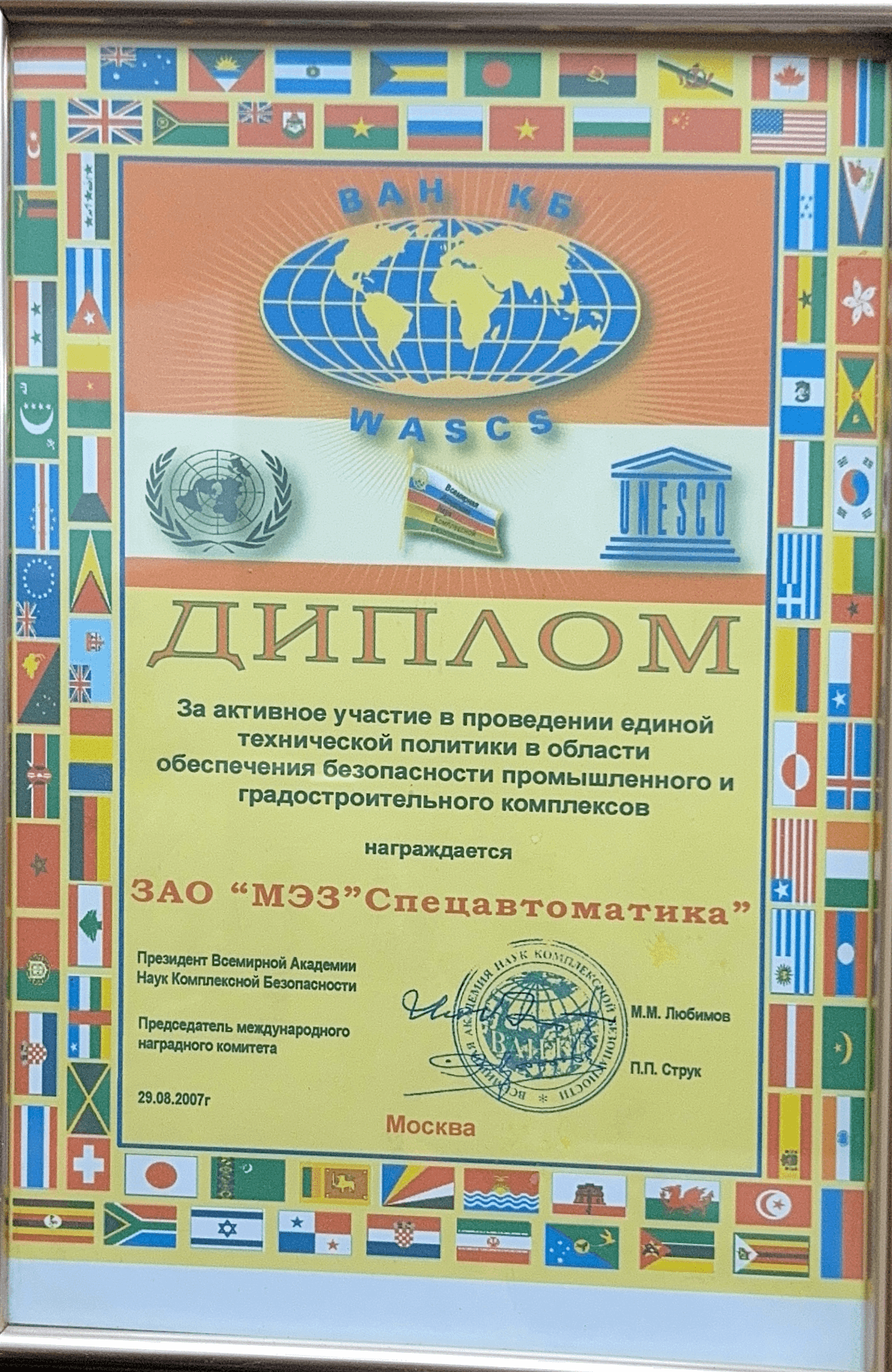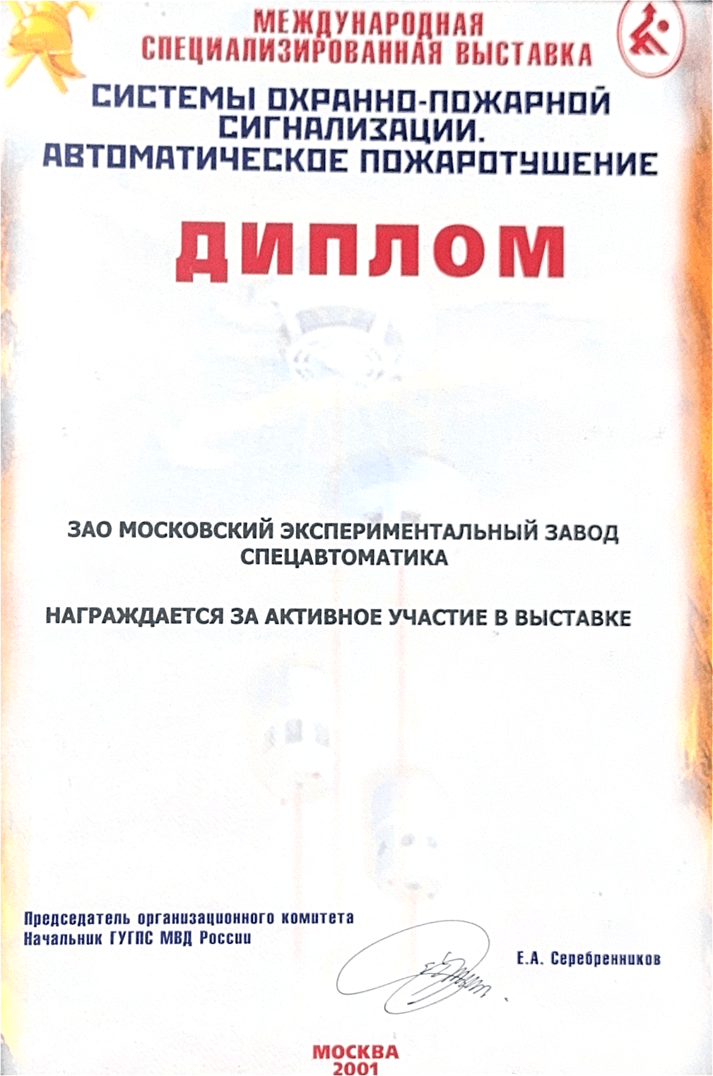 Диплом, международная специализированная выставка, системы охранно-пожарной сигнализации,2001г |