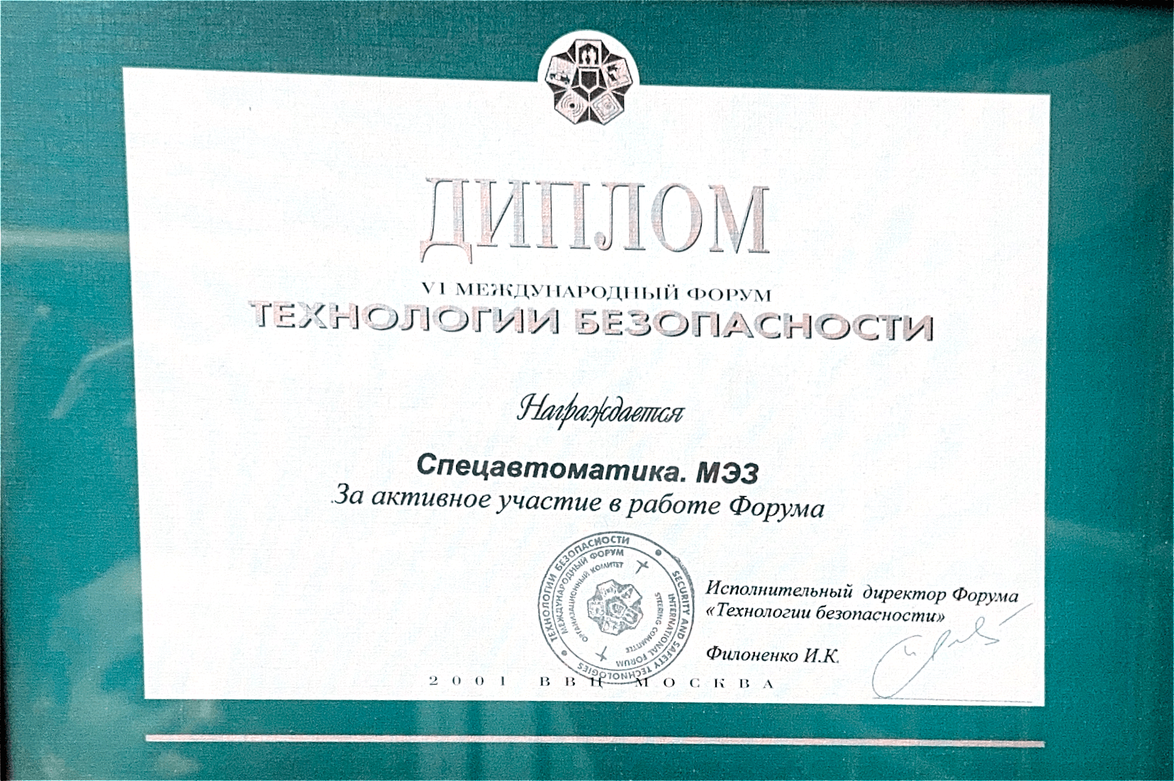 Диплом, 6 международнай форум технологии безопасности,2001г |