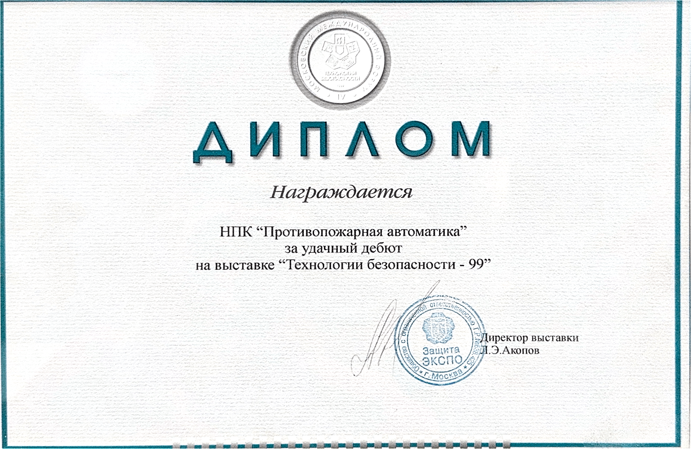 Диплом за удачный дебют, IV международный форум технологии безопасности, 1999г |