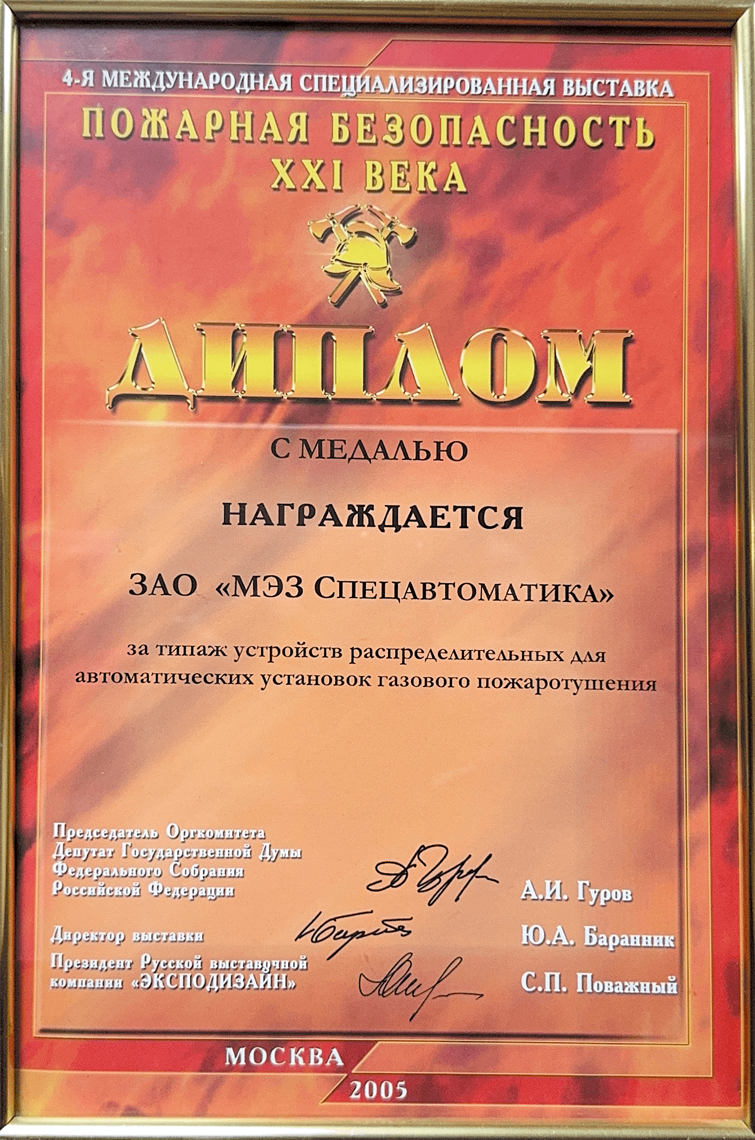 Диплом, 4 международная выставка Пожарная безопасность 21 века, 2005г |