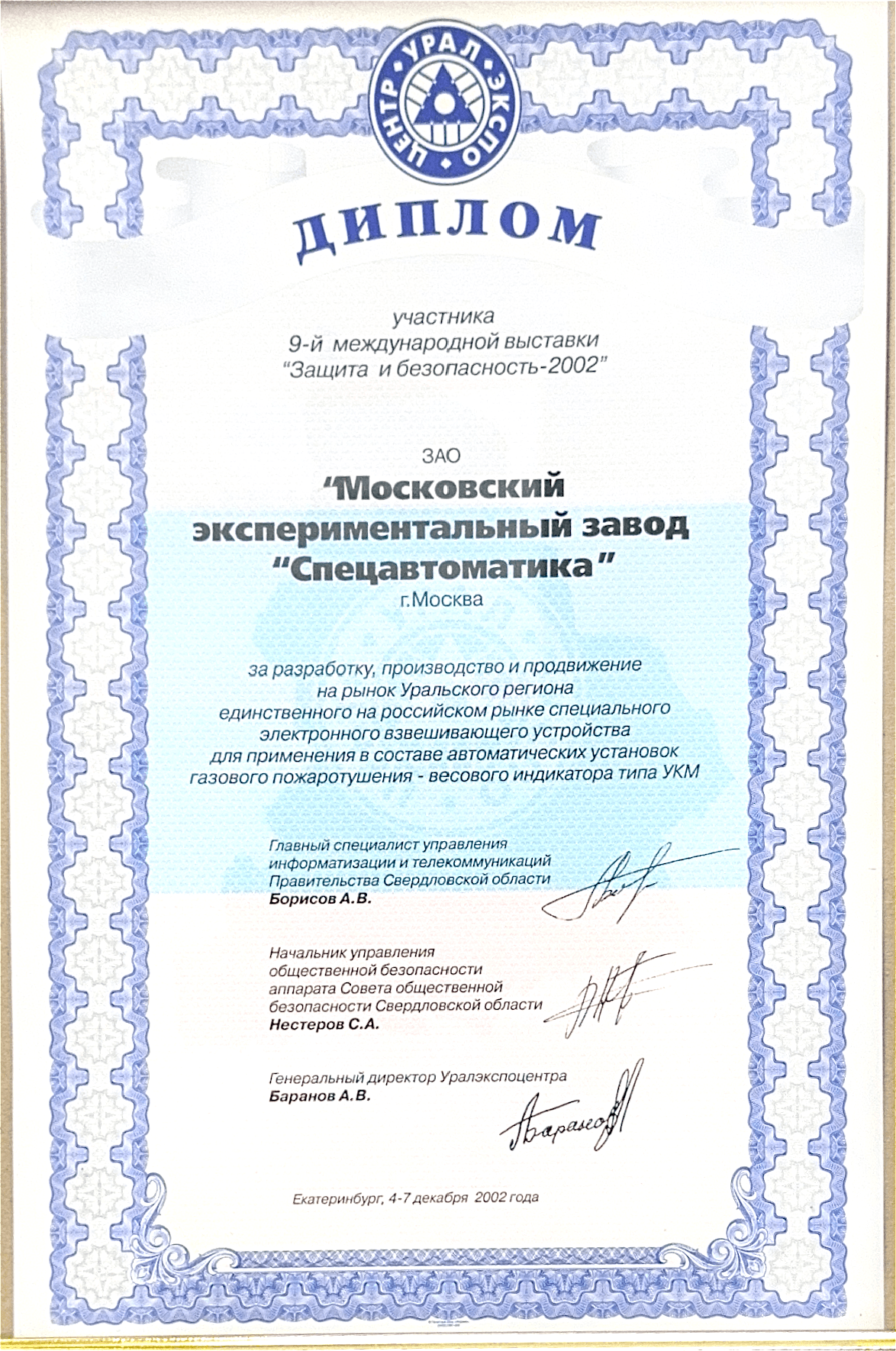 Диплом участника 9-й международной выставки "защита и безопасность 2002" |