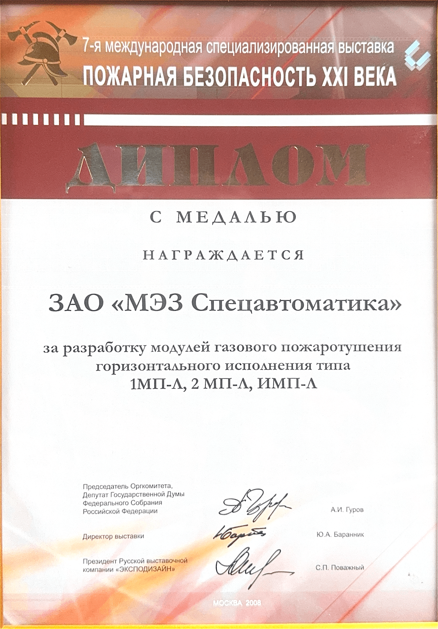Диплом, 7 международная выставка Пожарная безопасность 21 века, 2008г |