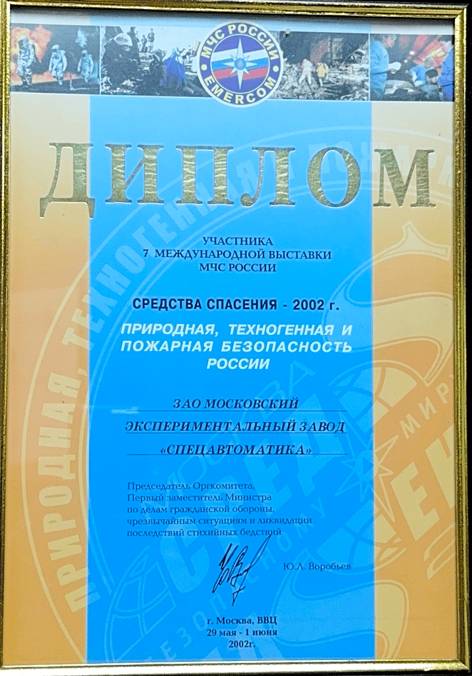 Диплом, 7-международная выставка мчс россии, средства спасения-2002, природная техногенная и пожарная безопасность. |