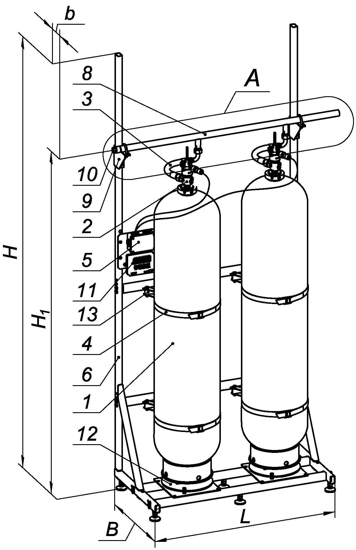 1 – Баллон 2 – ЗПУ 3 – Рукав высокого давления 4 – Хомут 5 – Электромонтажный блок 6 – Рама 7 – Обратный клапан 8 – Коллектор 9 – Опора коллектора 10 – Место под СДУ 11 – Весовой терминал 12 – Весовая площадка 13 – Пружинный узел |
