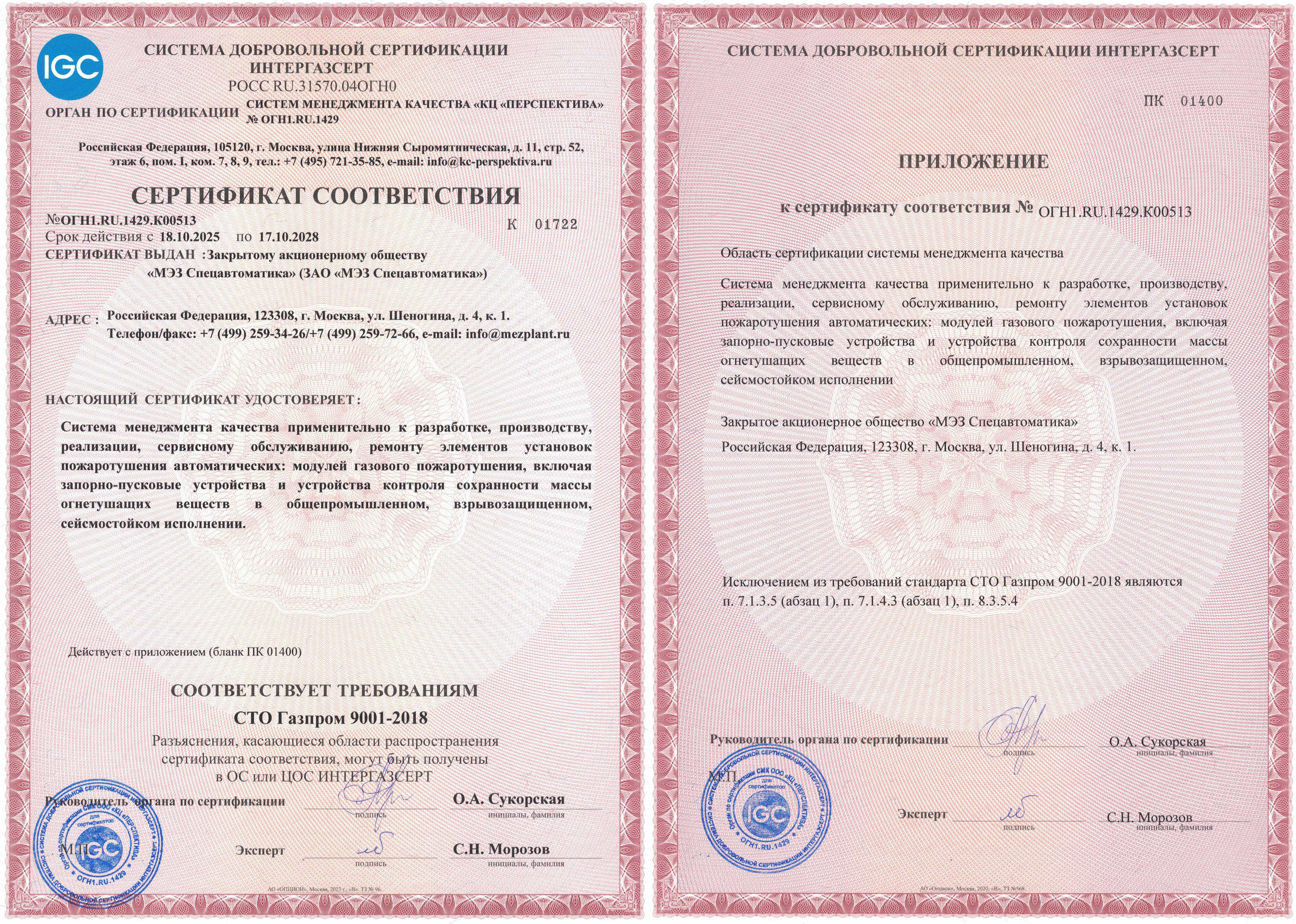 Система менеджмента качества ЗАО «МЭЗ Спецавтоматика» применительно к разработке, производству, реализации, сервисному обслуживанию, ремонту элементов установок пожаротушения автоматических: модулей газового пожаротушения, включая запорно-пусковые устройства и устройства контроля сохранности массы огнетушащих веществ в общепромышленном, взрывозащищенном, сейсмостойком исполнении соответствует требованиям СТО Газпром 9001-2018